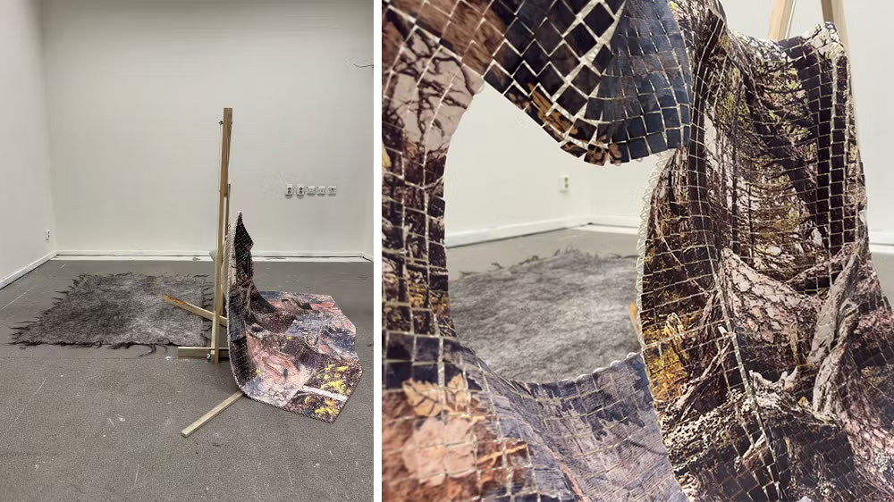 Den portabla installationen "Två odjur vaktandes ett vilt träd" består av tre element; en 3D-printad textil med ett tryck, en tovad filt och en träkonstruktion. Konstruerad att kunna bäras av en person samt installeras utan några verktyg.