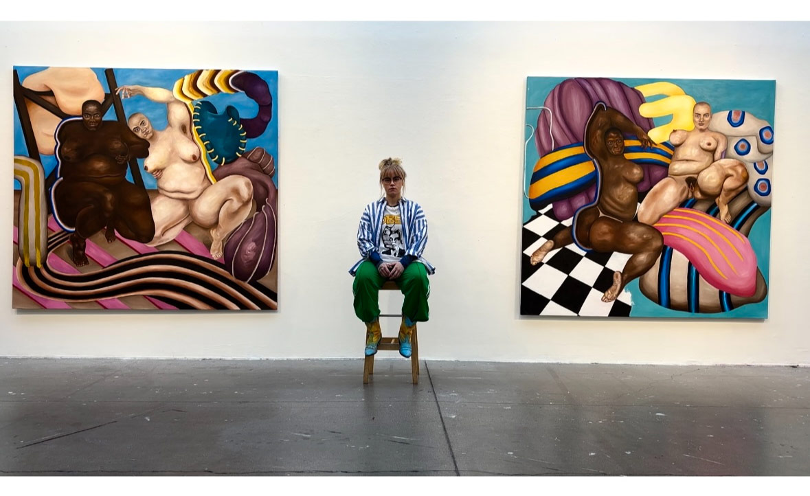 – Mina målningar kretsar kring mina egna erfarenheter av lesbiska relationer, komplexa känslor, kvinnokroppen och det queera. Den homosexuella berättelsen som en konversation, som bör undvikas och vars kärlek inte bör visas, då tänker jag på de relationer jag befunnit mig i när två kvinnokroppar tar plats på duken.